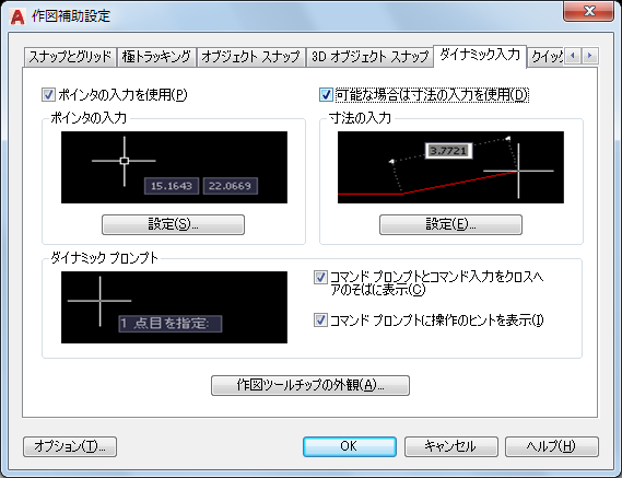ポインタ入力、寸法入力、ダイナミック プロンプト、および作図ツールチップの外観をコントロールします。