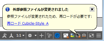 既定では、参照ファイルが変更されると、アプリケーション ウィンドウの右下コーナーに表示されている[外部参照]アイコンの近くにバルーン メッセージが表示されます。バルーンのリンクをクリックすると、変更されたすべての外部参照が再ロードされます。