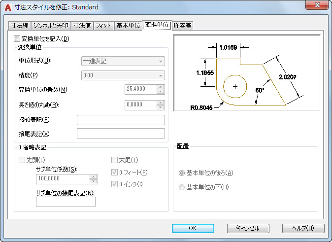 変換単位の単位形式を設定します。(システム変数 DIMALTU[併記寸法単位])