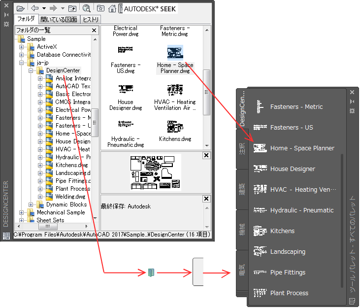 - DesignCenter から図面、ブロック、ハッチングをドラッグします。ツール パレットに追加した図面は、図面にドラッグしたときにブロックとして挿入されます。