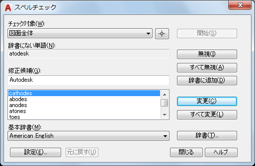 1 行文字、マルチ テキスト、マルチ引出線文字、ブロック属性内の文字、外部参照内の文字、寸法に追加された文字のスペルがチェックされます。