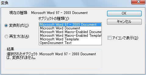 埋め込みオブジェクトを、[オブジェクトの種類]リストから選択した種類に変換します。