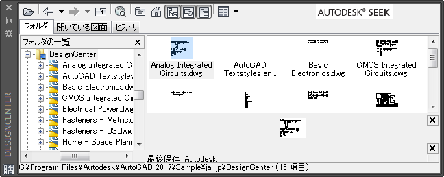 左側に表示されているツリー表示を使用して、コンテンツのソースを参照したり、右側のコンテンツ領域にコンテンツを表示します。コンテンツ領域から、図面またはツール パレットに項目を追加できます。選択した図面、ブロック、ハッチング パターン、外部参照のプレビューまたは説明が表示されます。