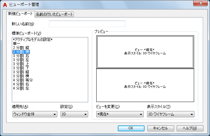 新しいモデル空間ビューポート設定の名前を指定します。名前を入力しない場合、作成したビューポート設定は適用されますが登録されません。ビューポート設定を登録しないと、レイアウトで使用できません。