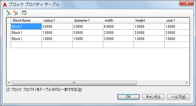 グリッド コントロールを使用して、ブロック定義に、ユーザ定義プロパティのバリエーションを定義します。