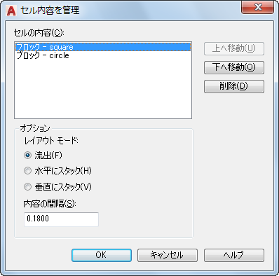 表のセルにブロックを挿入する場合は、ブロックを自動的にセルのサイズに合わせることも、ブロックのサイズに合わせてセルを調整することもできます。ブロックは、ショートカット メニューから挿入できます。複数のブロックを、1 つのセルに挿入できます。セルに複数のブロックがある場合、[セル内容を管理]ダイアログ ボックスを使用して、セルの内容を表示する方法をカスタマイズします。