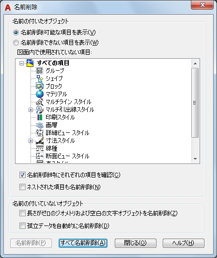 現在の図面で使用されていない、名前削除できる名前の付いたオブジェクトが一覧表示されます。