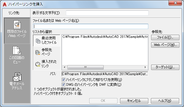 ハイパーリンクに関連付けたファイルへのパスが表示されます。[ハイパーリンクに対して相対パスを使用]チェック ボックスをオンにしているときは、ファイル名だけが表示されます。このチェック ボックスをオフにしているときは、絶対パスとファイル名が表示されます。