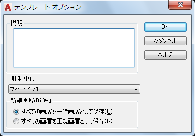 [テンプレート オプション]ダイアログ ボックスは、ファイルの種類として *.dwt を選択し、テンプレート ファイルの名前を入力し、[保存]をクリックすると、自動的に表示されます。