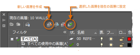 新しい画層を作成するには、下図の[新規画層を作成]ボタンをクリックし、新しい画層の名前を入力します。別の画層を現在の画層にするには、画層をクリックし、次に[現在に設定]ボタンをクリックします。