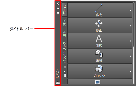 タイトル バーをクリックし、ドッキング解除されているリボンを作図領域の左端、右端、または一番上にドラッグします。