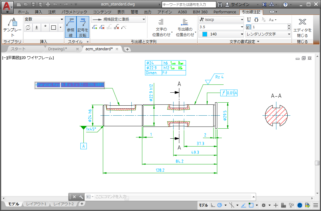 引出線の頂点を選択すると、すぐにコンテキスト リボン タブが表示されます。インプレイス エディタでは、MTEXT[マルチテキスト]コマンドを使用して文字を指定する場合と同様に注記文字を指定できます。[注記]ダイアログ ボックスで使用できた機能はすべて、新しいコンテキスト タブで使用できます。引き続き[注記]ダイアログ ボックスを使用する場合は、AMNOTETAB システム変数を 0 に設定することでコンテキスト タブをオフにすることができます。