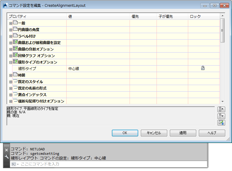 コマンド設定はコマンドに適用され、AutoCAD Civil 3Dの[ツールスペース]の[設定]タブで、各項目の[コマンド]フォルダに対応します。各コマンド設定には、SettingsCmdCommandName という名前の対応するクラスがあります。たとえば、CreateAlignmentLayout コマンドに対応する設定クラスは、SettingsCmdCreateAlignmentLayout です。他の設定タイプと同じように、CivilDocument.Settings.GetSettings() メソッドを使用して、ドキュメントのコマンド設定オブジェクトにアクセスします。