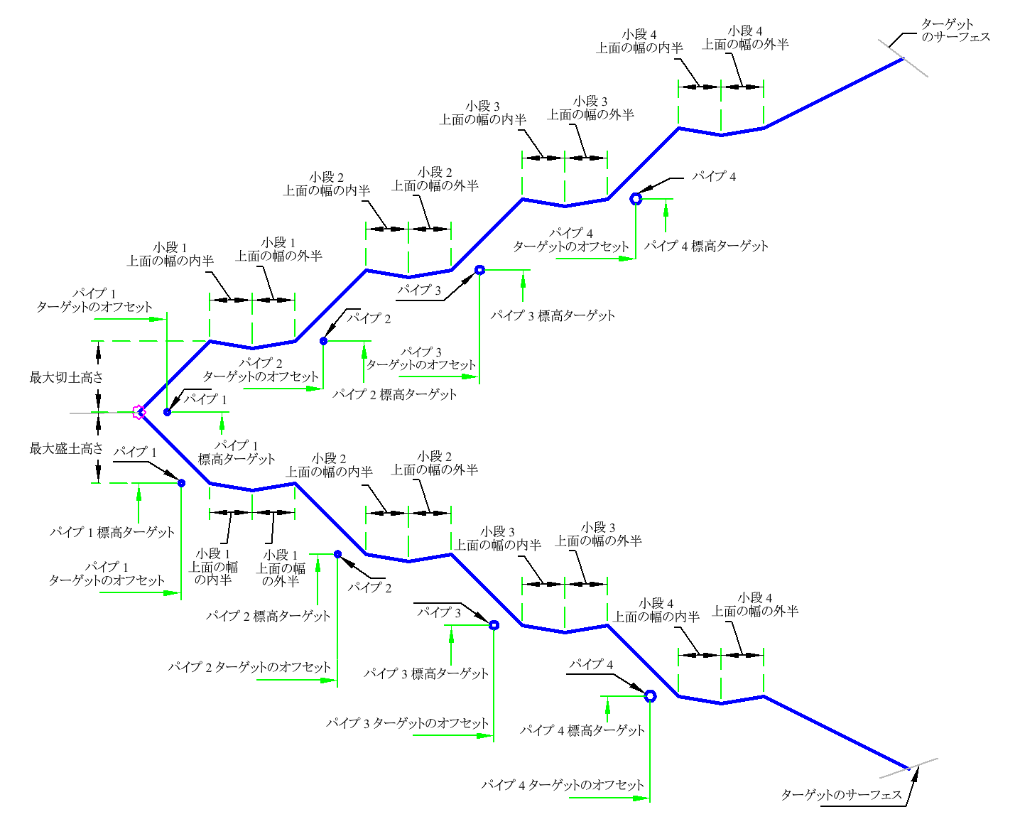 小段排水溝の幅を定義できます。パイプは各小段に追加されます。ターゲット サーフェスへの最後の法面展開勾配は、小段の勾配と異なる場合があります。