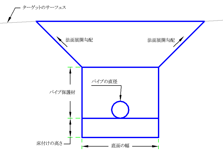 | ターゲット サーフェスの勾配 | トレンチの法面の x : 1 勾配。 | 数値、正 |
