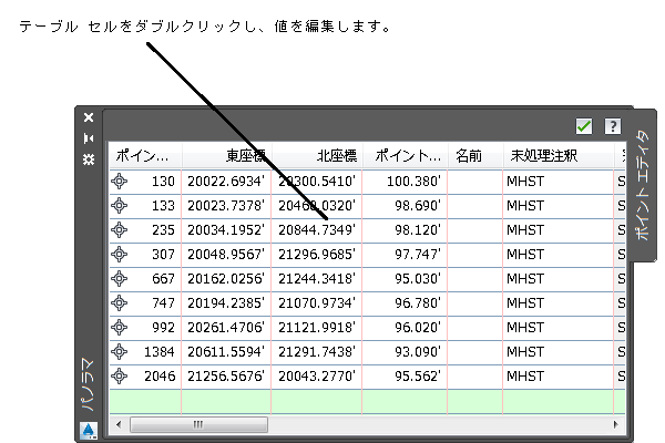 アイテム ビューではテーブルが表示されます。このテーブル内で、選択されたコレクション内の各オブジェクトのデータを確認および編集することができます。たとえば、ポイント グループを選択すると、アイテム ビューのテーブルに、グループに含まれる各ポイントの行が表示されます。