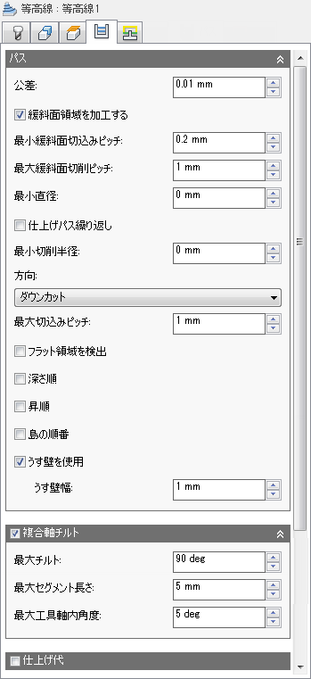 等高線仕上げはパーツの急斜面領域加工をするときに最も効果的です。すべての仕上げ加工法と同様に、この加工は工具接触角度により制限されます。この方法を使用して、急斜面領域への等高線仕上げパスを制限することができます。
