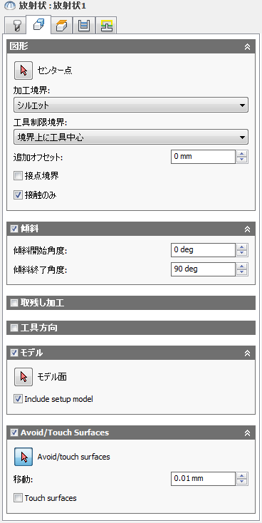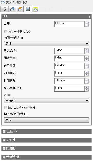 放射状および軸方向の仕上げ代はどちらも負の値にすることができます。ただし、負の仕上げ代は工具半径よりも小さくする必要があります。