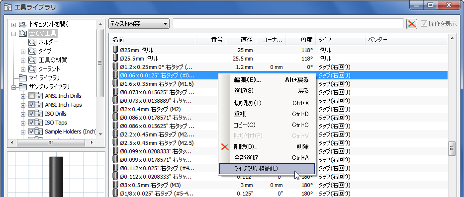 フォルダ検索機能を使用する場合、特定の工具が格納されている対応するライブラリを開く必要がある場合があります。工具を右クリックして、ポップアップ コンテキスト メニューから[ライブラリに格納]を選択します。