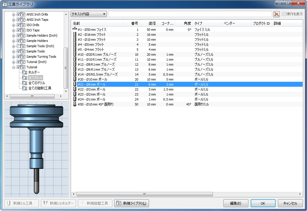 [工具]ボタンをクリックして、[工具ライブラリ]を開きます。ツリーを展開して工具ライブラリから既存の工具を選択し、[OK]ボタンをクリックして工具を選択します。または、[新規ミル工具]ボタンをクリックし、パラメータを編集して[選択]ボタンをクリックすることで、新しい工具を作成することができます。