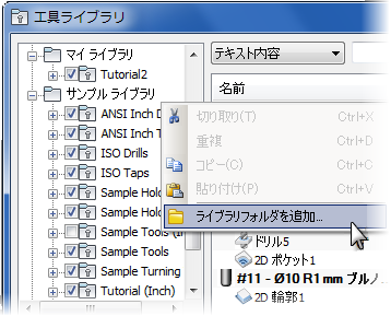 PC 上の別のフォルダに工具ライブラリを保持する場合、またはネットワークで共有する場合は、ライブラリ ツリー内で右クリックして、ポップアップ コンテキスト メニューから[ライブラリ フォルダを追加]を選択することにより、追加のライブラリ フォルダを追加することができます。