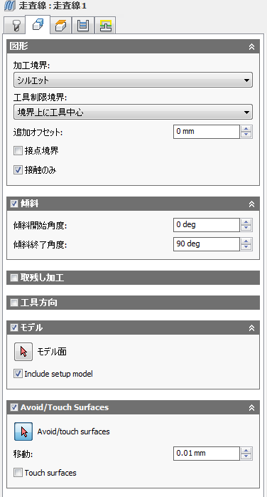 既定では有効になっています。操作で選択したモデルのサーフェスに加えて、セットアップで選択したモデルも含まれます。このチェック ボックスをオフにすると、操作で選択したサーフェス上にのみツールパスが生成されます。
