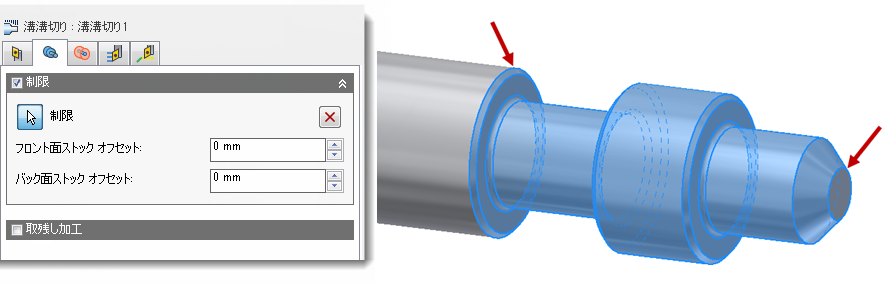 Inventor HSM の旋盤操作では、選択した操作タイプに基づいて、残っているストックを可能な限りすべて旋削するよう試行します。ジオメトリ制限を使用すると、パーツの特定の領域内にツールパスを収めることができます。