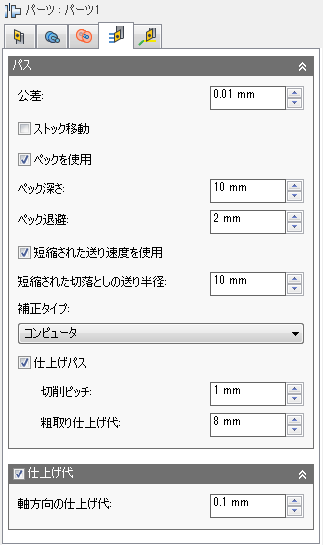 [正の仕上げ代]: 後続の粗取りまたは仕上げ操作で削除すべき、操作後の残りストックの量です。粗取り操作のために、既定値は少量の材料を残します。