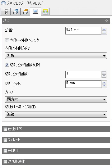 スキャロップ仕上げはパーツ全体の仕上げに使うことも可能ですが、輪郭パスと走査線パスの次に削り残しの部分で使われることが多いです。