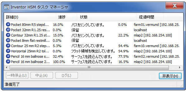 Inventor HSM [タスク マネージャ]では、有効になっている[サーバ]列に、利用中のワークステーションが表示されます。この場合、ローカル ワークステーションに加え、4 台の異なるワークステーションでツールパス計算が実行されています。