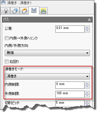 [渦巻き仕上げ]方法には、いくつかの異なるモードの操作があります。モードは、[パス]タブにある[渦巻きモード]ドロップダウン リストから選択します。