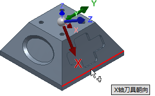 - 次に、X 軸の方向を指定する必要があります。[工具方向 X 軸]ボタンがアクティブであることを確認し、次の図に示すように、パーツの水平エッジを選択します。