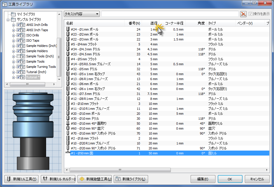 フィールド列をクリックして、工具ライブラリ内に表示される工具を並べ替えることができます。たとえば、工具を直径別に並べ替える場合は、[直径]列をクリックします。同じ列を 2 回クリックすると、昇順と降順の間で切り替わります。