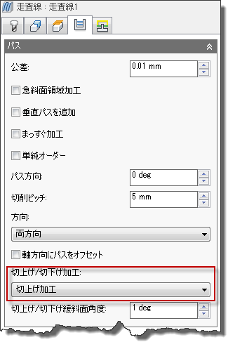 ペンシル、スキャロップ、走査線、放射状、渦巻きなどの加工方法では、Z で上下に移動するツールパスを生成します。使用する工具によって、切下げまたは切上げのみを行うことができます。これは、Inventor HSM では[切上げ/切下げ加工]ドロップダウン メニューがあるこの[パス]タブでコントロールできます。