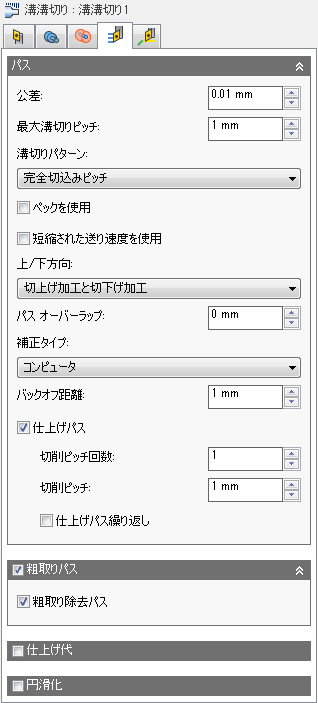 [正の仕上げ代]: 後続の粗取りまたは仕上げ操作で削除すべき、操作後の残りストックの量です。粗取り操作のために、既定値は少量の材料を残します。