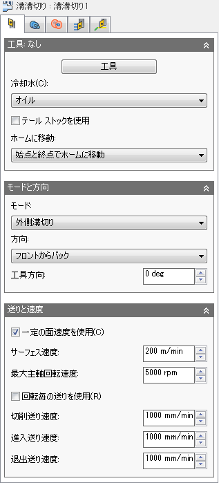この設定では、旋盤加工法(プロファイルまたは溝切り)に応じて、工具で軸方向に加工するか、径方向に加工するか、および進入方向または退避方向を指定します。