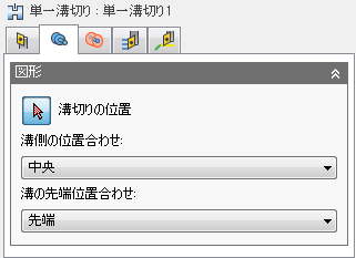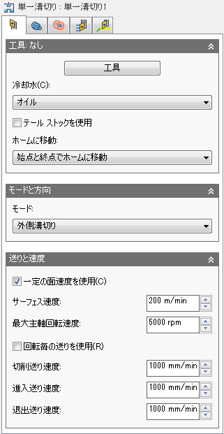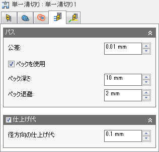 [単一溝切り]加工法は、選択した位置でのみ溝切りを行う場合に使用します。たとえば、ねじ切りの前にバック面で溝切りを行う場合に使用できます。