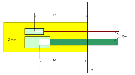 B: 平面 A とワイヤ端点が挿入された位置との距離ピン穴のサイズが異なるコネクタの場合、ピン穴の深さに応じて、挿入されるワイヤごとに B が異なる場合があります。この例では、B は B1 または B2 のいずれかと等しくなります。