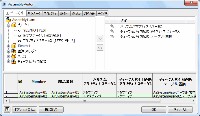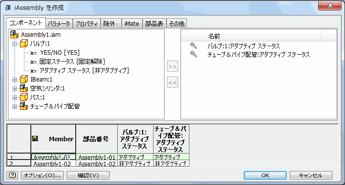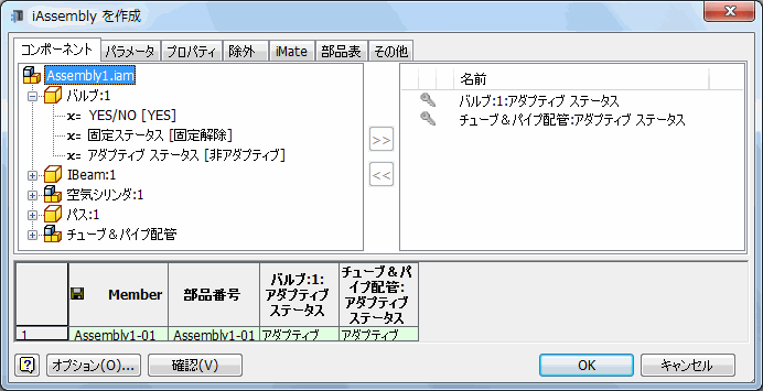 [iPart/iAssembly オーサリング]の順にクリックします。 マスター配管アセンブリのファイル名が候補オブジェクト一覧に表示されます(既定は、チューブ&パイプ配管です)。設定テーブル中でアダプティブ ステータスが自動的に選択されます。