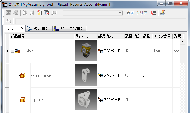 - 部品表には、アセンブリ内で参照されたコンポーネントが表示されます。