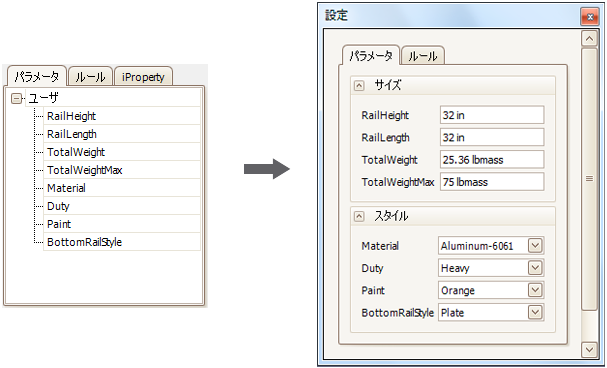 カスタム ユーザ インタフェースを作成し、Inventor のパーツ、アセンブリ、または図面ドキュメントのパラメータ、プロパティ、およびルールに接続します。