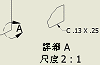 面取りエッジがビュー境界(破断図、部分断面図、断面図、または詳細図)で切断されている場合、面取りの注記はエッジと同じ長さに基づいています。既定では、引出線は、表示エッジの中点にアタッチされます。 |