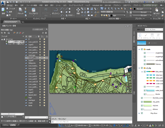 このマップには AutoCAD 画層(左側)と表示マネージャ画層(右側)の両方が含まれます。