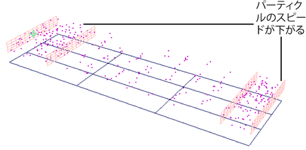 この比率はパーティクルのスピードにも間接的な影響を与えます。上記の例では、フロー領域の最後に到達するまでにパーティクルの全寿命の半分しか経過しないため、パーティクルのスピードが上がります。