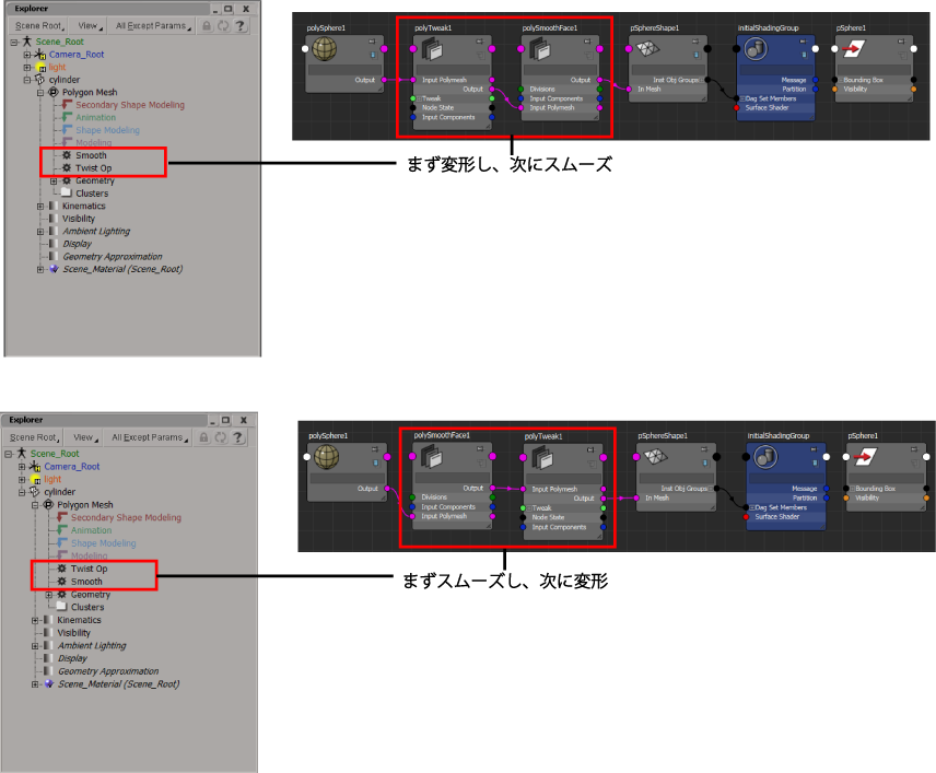 次の例は、Maya と Softimage の 2 つの操作、デフォームとスムーズの順序を反転する方法を比較します。