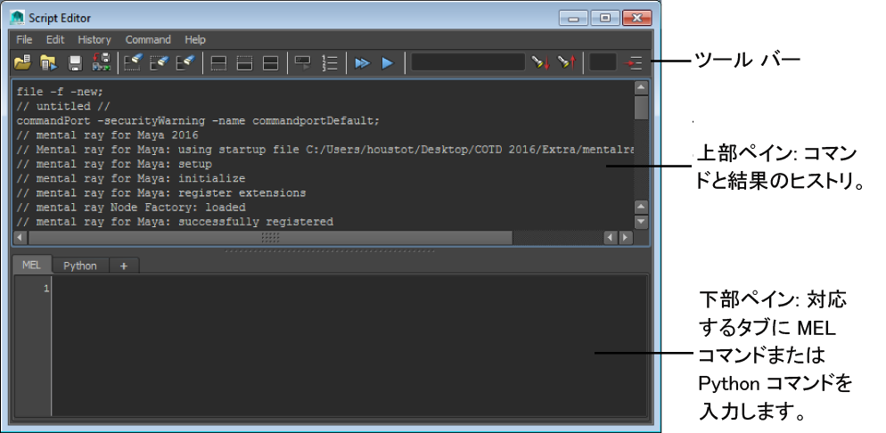 下部ペインの MEL または Python タブでコマンドとスクリプトを入力します。