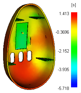 平均固化時間は、成形品の形状と冷却システムに基づいて計算されます。赤色で表示される正の値でプロットされている領域では、固化に要する時間が平均より長くなっています。青色で表示される負の値でプロットされている領域では、固化に要する時間が平均より短くなっています。この結果の 0 の値は平均固化時間を表します。