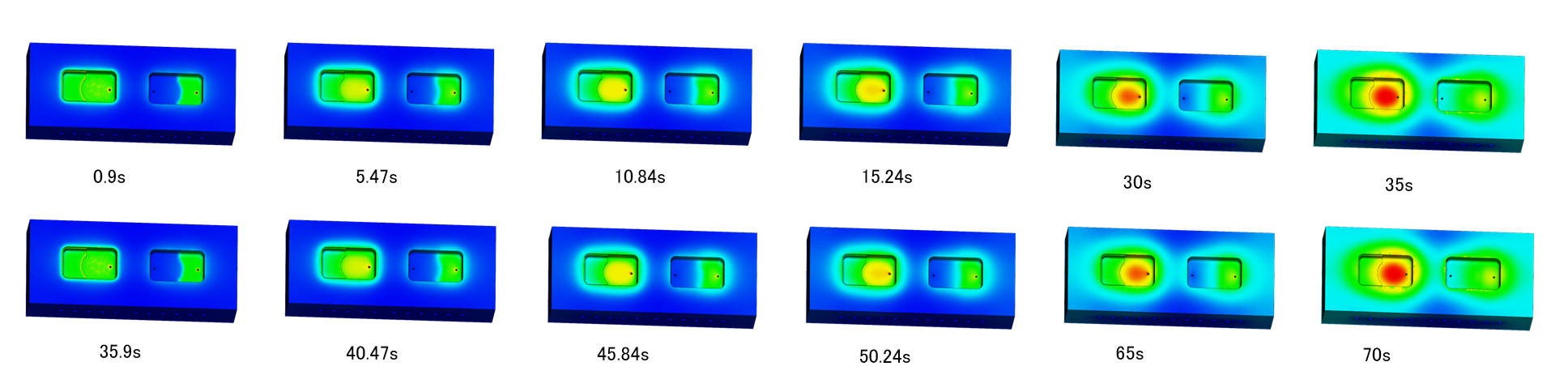 図 3 では、結果の最初の行が最初のサイクルに対応しています。第 1 ショットは左側のキャビティに射出され、第 2 ショットは右側のキャビティ内の既存の最初の成形品の上に射出されます。この最初のサイクル タイム後に、図 2 に示すように、回転盤が回転します。図 3 の 2 行目に表示されている結果は、オーバーモールディング サイクルタイムの 2 番目のサイクル タイムを表します。図 2 の緑色の部分は、画面の左側に示されています。