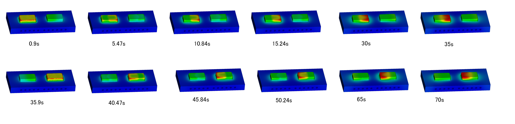 前述のモデルの例を見てみましょう(図 1)。図 3 と図 4 は、2 つの隣接する射出成形サイクルの回転盤と固定盤の温度フィールド プロットを示します。