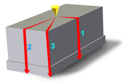 各フロー パスは、それぞれ長さが異なるため、この成形品の肉厚が均一な場合、最初にフロー パス 1 の充填が完了し、次にフロー パス 2、最後にフロー パス 3 の充填が完了します。